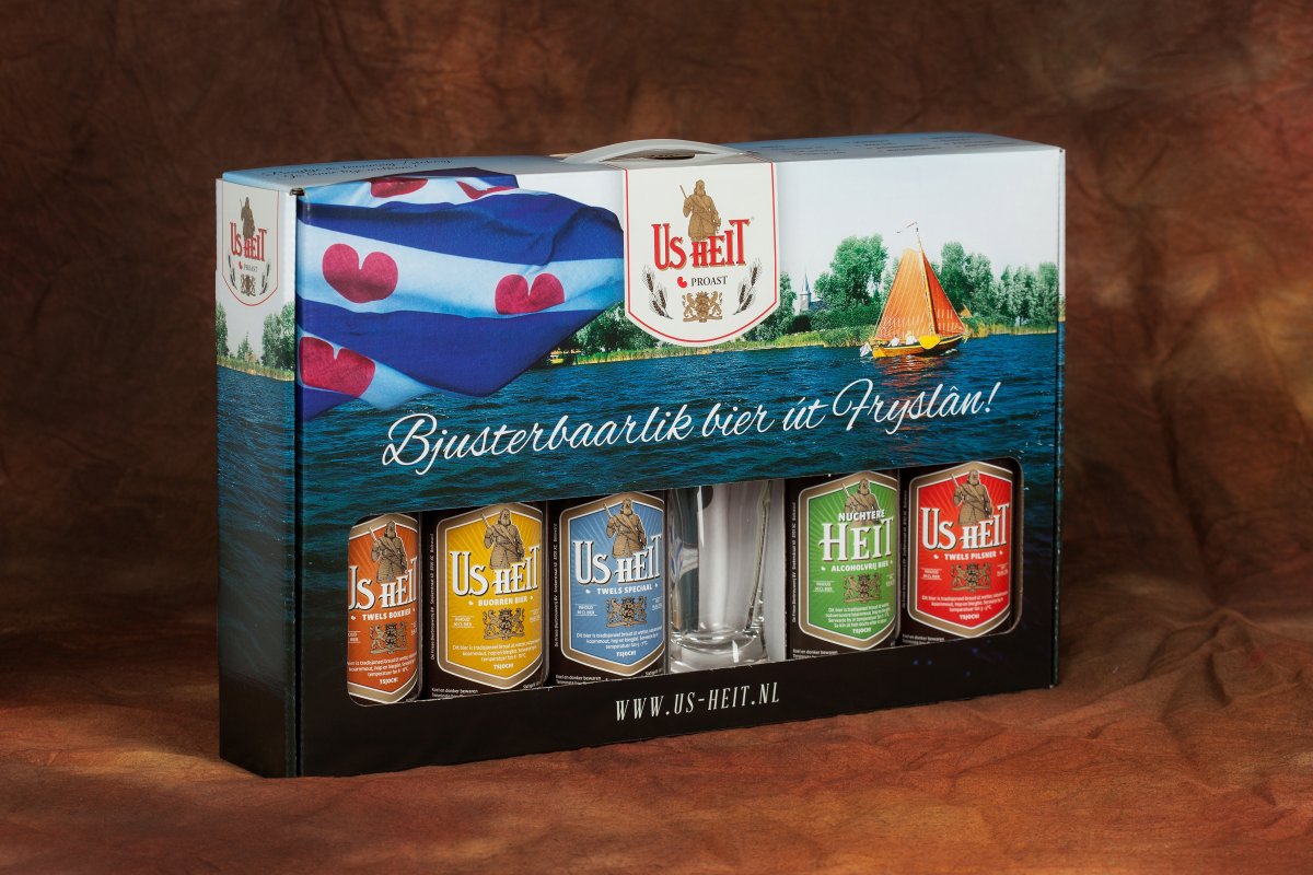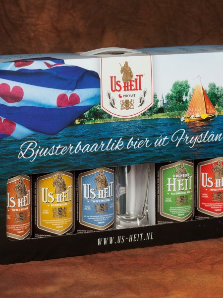 Hierin is een flesje Us Heit Pilsener verpakt samen met een fles Twels Speciaal, een fles Us Heit Buorren, een Nuchtere Heit, een fles Us Heit Bokbier en een mooi glas met Us Heit logo.