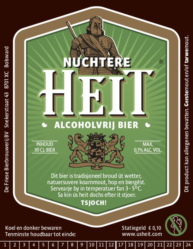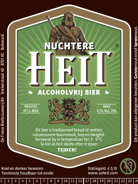 Weet u hoe de Friezen altijd bij de pinken blijven? Het geheim schuilt in Nuchtere Heit. Dit alcoholvrije bier is niet alleen een vrolijke innemer, het zorgt er tevens voor dat u met beide benen op de grond blijft staan. De onvergiste moutsuikers geven een moutige en zoete smaak.
